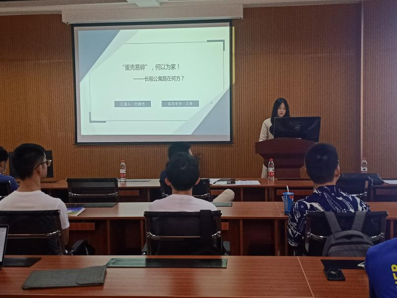 杜婧怡同学此次汇报内容为案例分析《蛋壳易碎,何以为家!——长租公寓路在何方》,此案例引起很大反响,王涛老师、王滨老师等都进行了点评,同学们也都积极踊跃发言,就此问题进行了探讨。