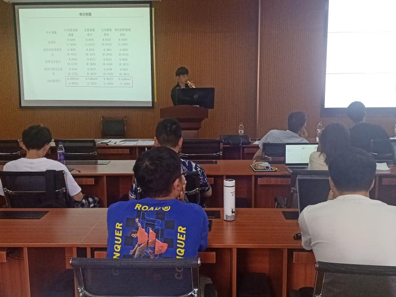 最后由刘港同学进行汇报,就《科技与金融结合试点政策促进了经济增长吗——基于双重差分的研究》进行汇报。由李俊霖博士进行点评,其他同学进行提问。