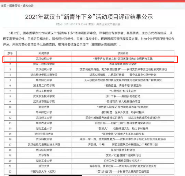 5月22日,共青团武汉市委举办了2021年武汉市“新青年下乡”活动项目评审会,由专家学者、基层代表、主办方代表等组成的评审团,从现实需要迫切性、目标定位精准性、服务设计科学性、现场展示和答辩等方面,对80个参评项目进行综合评分。最终,由我校太阳集团tyc33455官网“青春护农”实践队申报的项目《“青春护农 茶旅文创”武汉黄陂特色农业调研与实践》从80个参评项目中脱颖而出,以第一名的优异成绩成功立项。
