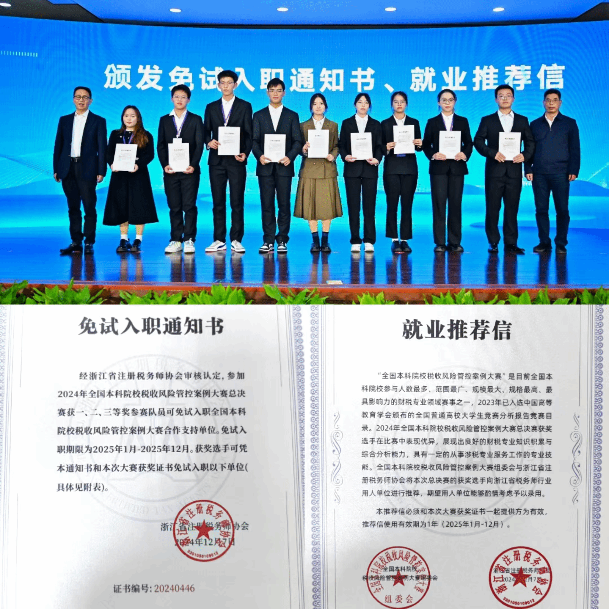 总决赛闭幕式现场,浙江省注册税务师协会行业党委委员、副会长兼秘书长刘炳荣为参赛代表们颁发了免试入职书。浙江省注册税务师协会副秘书长黄方仁上台为参赛选手代表颁发就业推荐信。获奖选手们获得了十余家税务师事务所的免试入职机会。