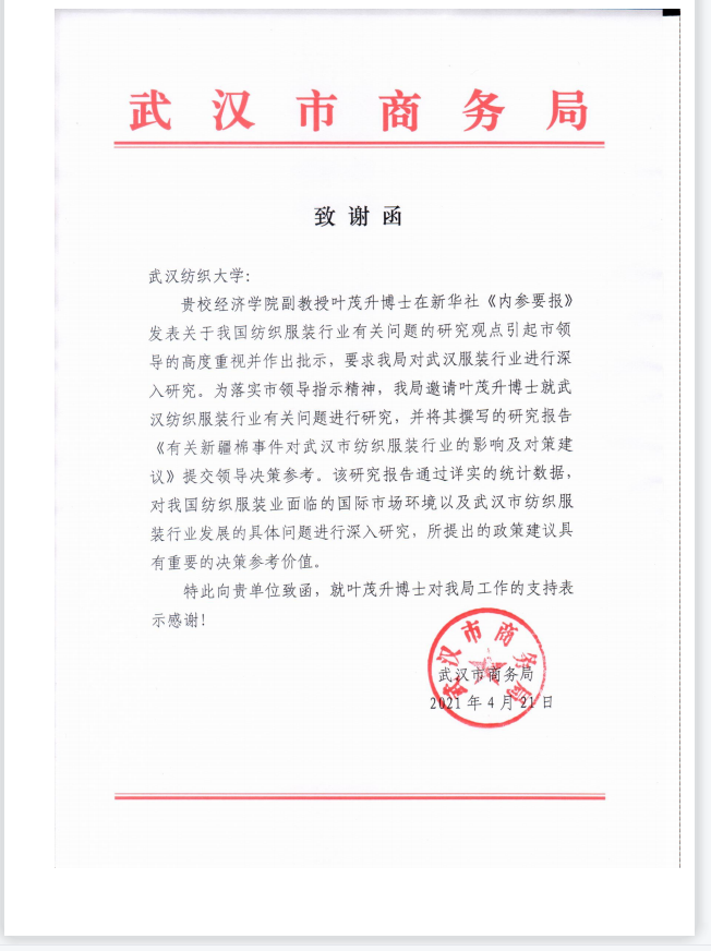 4月21日,武汉市商务局向我校发来致谢函,对我校太阳集团tyc33455官网叶茂升副教授为服务武汉市纺织服装行业发展提供的智力支持表示充分肯定与诚挚感谢。