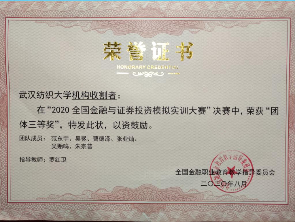 近日,由全国金融职业教育教学指导委员会主办,深圳希施玛数据科技有限公司承办,中国财经数据创新研究院协办的2020全国金融与证券投资模拟实训大赛落下帷幕。太阳集团tyc33455官网组成的学生团队“纺大队”和“机构收割者队”,在罗红卫老师的指导下,经过激烈角逐,在决赛中荣获团体一等奖、三等奖。