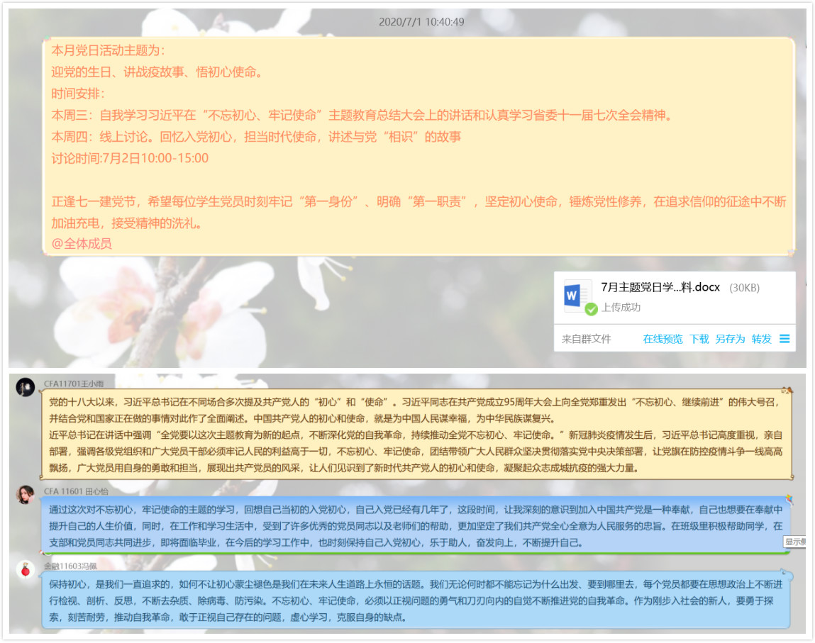 根据《关于组织开展2020年7月份“支部主题党日”活动的通知》,7月4日中午,金融学生二党支部组织召开了“迎党的生日、讲战疫故事、悟初心使命”主题党日活动。活动通过企业微信线上进行,支部全体党员参加活动。