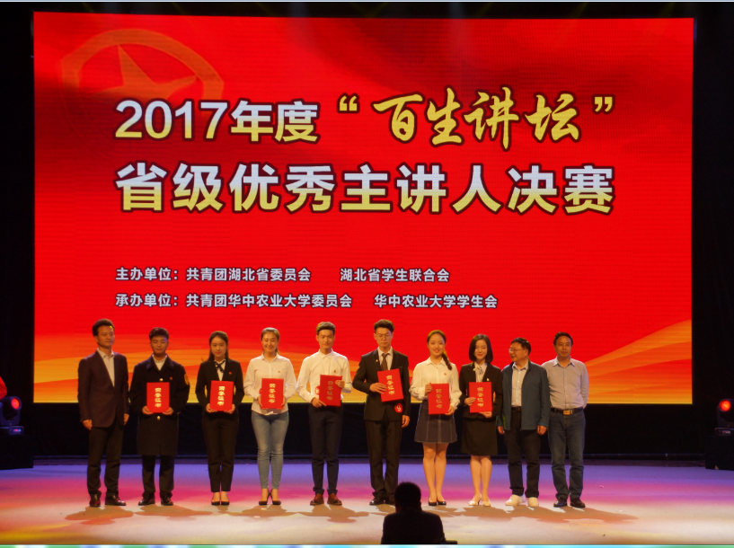 3月31日下午,2017年度“百生讲坛”——湖北高校共青团学习习近平新时代中国特色社会主义思想和党的十九大精神省级优秀主讲人决赛在华中农业大学举行。我校太阳集团tyc33455官网王芷仪同学荣获三等奖,郭文璐同学荣获优秀奖。