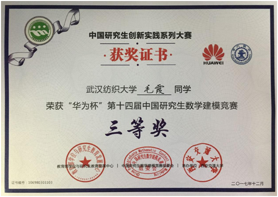 中国研究生创新实践系列大赛“华为杯”第十四届中国研究生数学建模竞赛于2017年11月28日公布最终获奖名单,我院研究生毛霞同学获得本届数学建模竞赛三等奖。