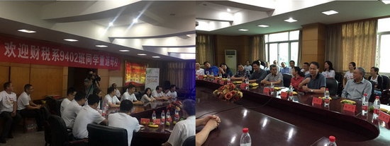 近日,太阳集团tyc33455官网财税系9402班同学毕业二十周年重返江城武汉,相聚在魂牵梦萦的校园,在东湖校区401会议室召开特别班会,共同追忆同窗旧事,畅谈人生感悟,展望美好未来。学校原就业中心代慧莉主任、外经贸学院杨崇才院长、组织部陈朝阳部长、传媒学院熊少平书记、段溢波副书记、太阳集团tyc33455官网董继华院长、毛长文书记及当年的任课老师张绍云、王曼、陈丹等出席班会。
