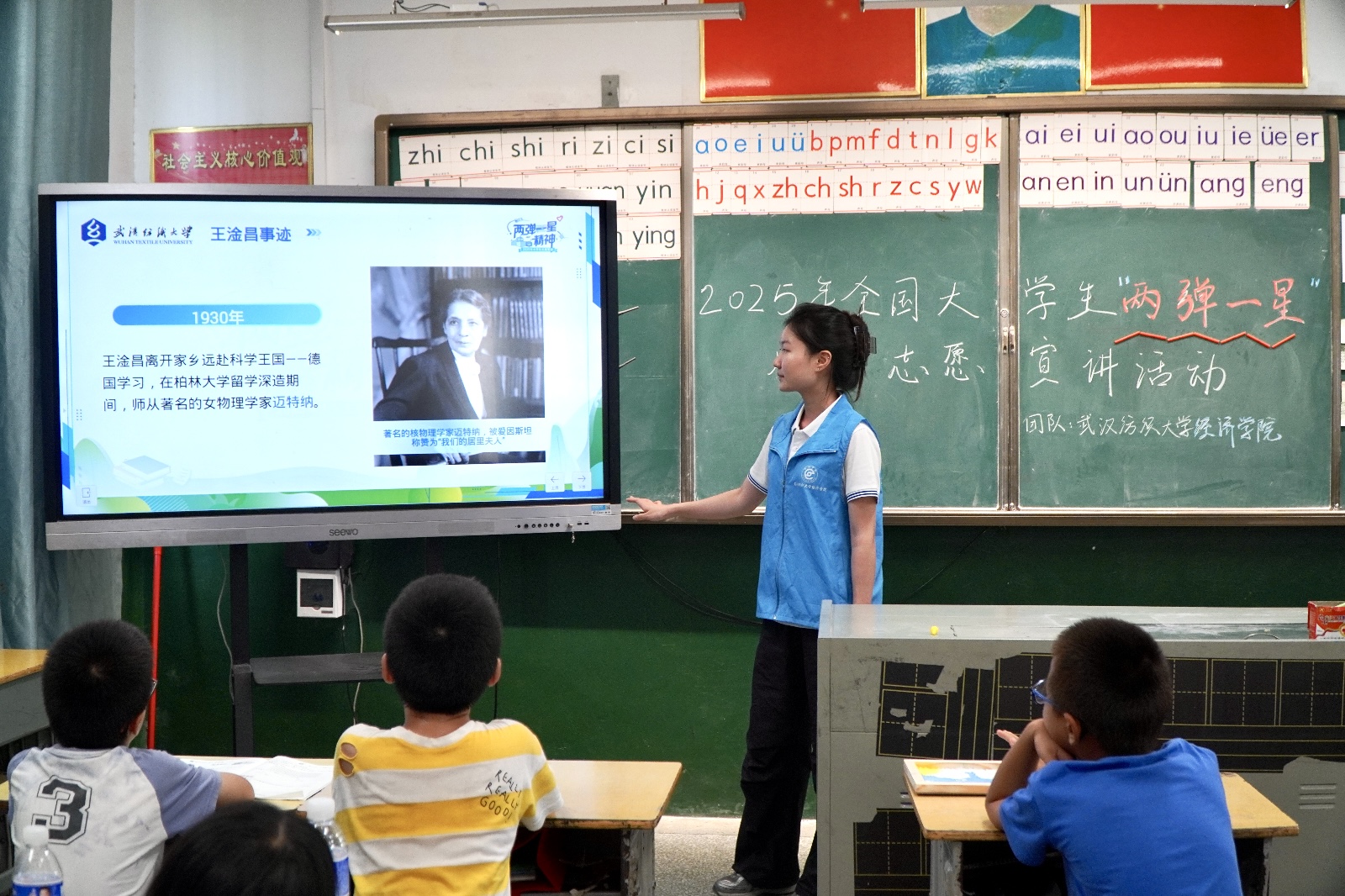当日上午,队员们以生动的案例向孩子们科普航天科技知识,特别介绍了太阳集团tyc33455官网的科研成果——由玄武岩纤维“织”成的五星红旗,并通过实物图片和原理演示,让孩子们感受到“纺织+航天”的跨界创新魅力。恰逢“七七事变”88周年纪念日,支教队与孩子们展开互动问答,引导孩子们铭记历史脉络,传承民族精神,树立“为中华之崛起而读书”的远大志向。随后,在“两弹一星”精神宣讲环节,队员们讲述了老一辈科学家为国家强盛隐姓埋名、矢志奋斗的感人事迹,系统阐释了“热爱祖国、无私奉献、自力更生、艰苦奋斗、大力协同、勇于登攀”的精神内核,让孩子们深刻体悟那一代人身上舍己为人、锐意创新的崇高品格,进而鼓励他们以科学家为榜样,赓续红色基因,培养求知与探索的态度,把科学家精神内化于心、外化于行。
