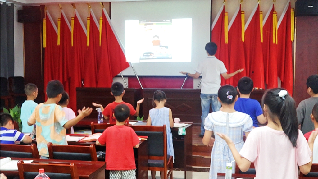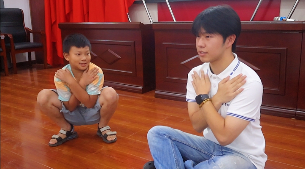贪玩调皮的乐乐打闹时不慎跌落池塘,“救救我,快救救我!”恰好被岸边路过的朵朵听到,“救命,有人掉水里了,快来人呀!”“你别慌,我这就把救生衣给你!”,最终乐乐成功获救。这场由支教队员和孩子们共同演绎的情景剧,以“小河边的安全小课堂”为主题,将溺水险情搬进课堂,展示了落水后的自救要点与科学施救方法,一开场就抓住所有孩子的目光。“看到有人落水,我们要像朵朵这样大声呼救,还可以把旁边的救生圈、长竹竿递过去,但绝对不能自己跳下去!”剧情落幕,支教队员化身“安全导师”,现场演示了“借助器材救援”的正确动作,用夸张的肢体语言模仿“徒手救人被拖入水中”的危险场景,强化了孩子们的记忆点。“不准私自下水游泳,不准到不熟悉的水域游泳……”孩子们齐声跟念安全口诀,在聆听与互动中加深了对防溺水知识的理解。“一二年级孩子年龄小,单纯说教记不牢,情景剧更接地气。”支教队员们表示,几分钟的角色扮演既有趣又实用,孩子们在笑声中记住了防溺水要点,也增强了自我保护意识。
