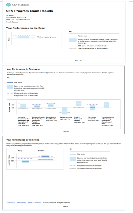 最后,CFA三级增加了行为金融学、投资的执行、控制、评估。行为金融学是历届上午题必出的内容,主要通过案例分析投资者属于何种行为偏差,情感偏差与认识偏差的区别,也是上午题中最容易得分的一项,但往往会放在最后一道题目,因此当时间不够时可以选择先做行为金融学的内容。下午题是选择题比二级的内容简单,如果下午题做的不错,也是可以通过的。三级复习建议买原版书,notes的内容不足以应对考试,另外真题最起码要做两遍,考试中会有跟真题差不多题目出现,因此在三级中做真题格外的重要。
