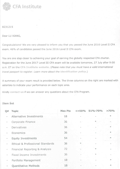 2018年8月底,CFA协会公布了2018年6月CFA三级考试成绩。我院2015届毕业生项露顺利通过考试,距离成为CFA持证人更近了一步。