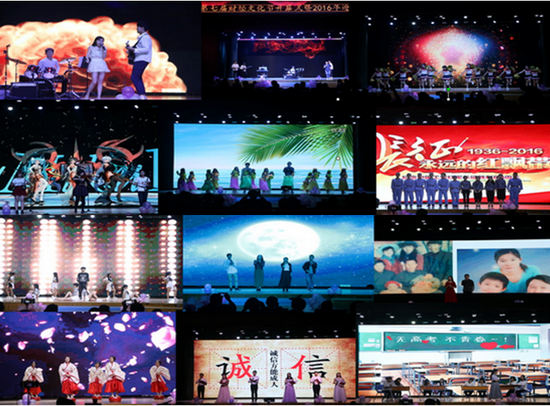 一首首动听的歌曲、一段段热情的舞蹈、一个个感人的画面深深吸引着现场观众,炫音社同学一曲《私奔到月球》画面甜蜜而温馨,浓浓爱意融化人心;民乐合奏《威风堂堂》将古风古韵与现代舞蹈完美结合,令观众耳目一新;草裙舞《Let me take you to rio》带我们感受了桑巴的热情似火;红色短剧《长征路上》,将士们嘹亮的口号“时刻准备着”深深感动着我们;爵士舞《worth it》让生命魅力挥洒,青春风采绽放;朴实无华的《一封家书》,唱出离家孩子的深切牵挂,感人肺腑;民族舞《相和歌》带我们领略中华文化的源远流长,博大精深;慷慨激昂的朗诵《诚信人》道出了“民无信不立,诚信方能成人”的真谛;舞台剧《我的大学》打开了尘封的高考记忆,也展望美好的大学未来。