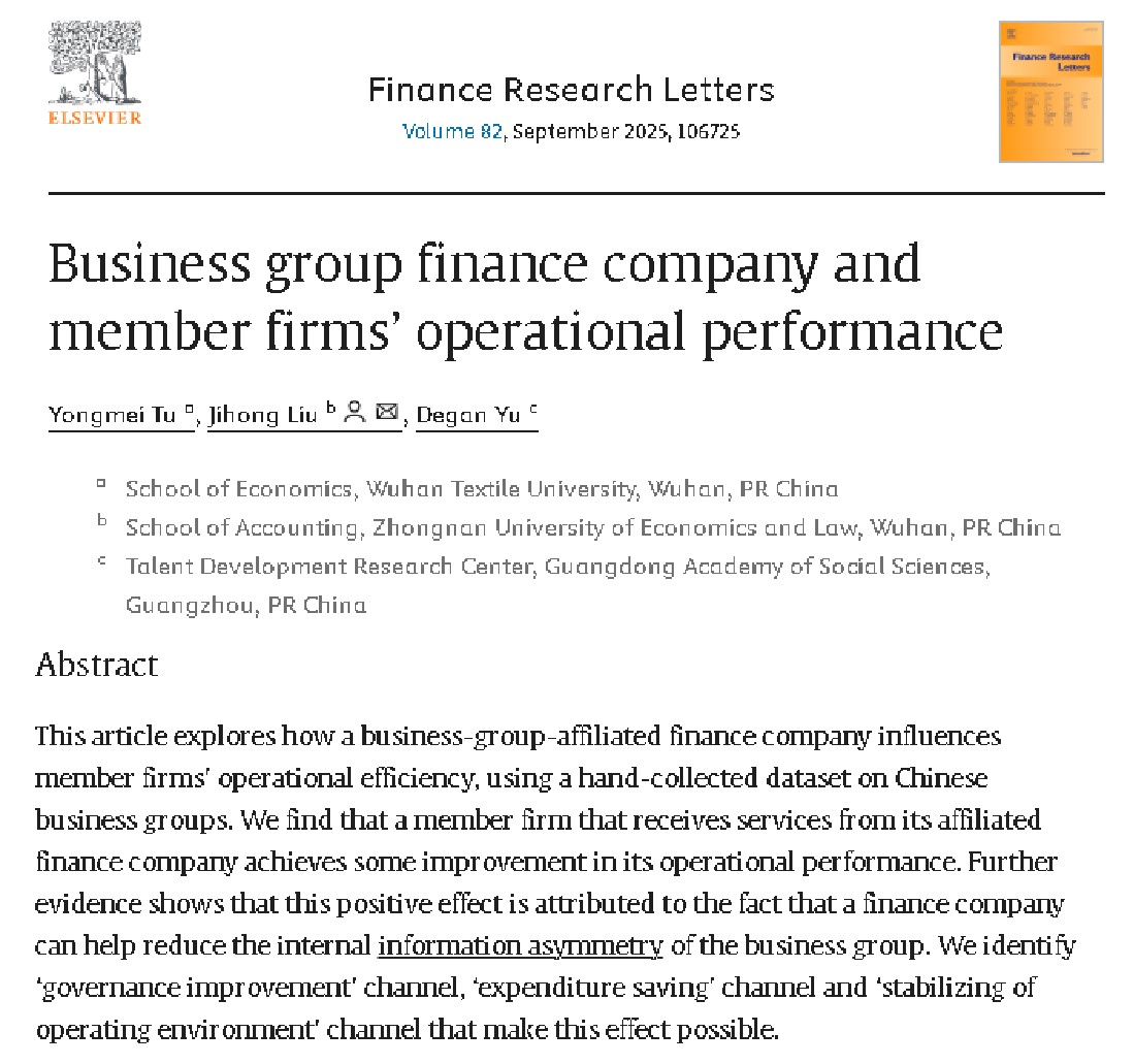 近日,太阳集团tyc33455官网涂咏梅教授合作完成的学术论文“Business Group Finance Company and Member Firms’ Operational Performance”在国际知名期刊Finance Research Letters在线发表。论文第一作者为涂咏梅教授,太阳集团tyc33455官网为第一作者单位。