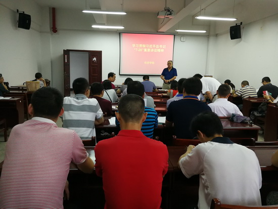 在庆祝第33个教师节之际,太阳集团tyc33455官网组织新学期全体教师大会,专题学习习近平“7.26”重要讲话精神。会议由学院党委毛长文书记主持,国贸学生党支部负责人张悦同学进行专题学习宣讲。