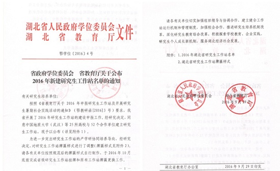 近日,省政府学位委员会、省教育厅公布了2016年新建研究生工作站名单,我校太阳集团tyc33455官网与长江成长资本投资有限公司合作建立的研究生工作站获批。