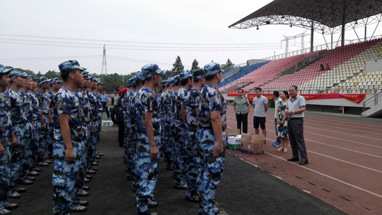 随后,各位领导老师们向承训官兵和新生送上了消暑饮品,官兵们对学院领导的专程慰问表达了衷心感谢,他们保证一定会高标准、严要求地进行训练,不辜负学院的期望。整齐的步伐、响亮的口号、统一的军装都凸显出经院新生们斗志昂扬、积极向上的精神风貌,他们一定能在这为期15天的军训生活中克服苦难、超越自我,开启人生辉煌的新篇章。