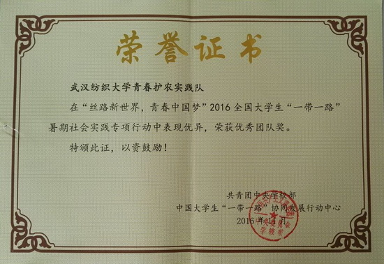 “青春护农”实践团队在由团中央学校部指导,人民网、中国青年报社共同主办的2016年大中专学生“三下乡”社会实践“千校千项”成果遴选宣传活动中,荣获“最具影响好项目”和“匠心传播正能量作品”两项荣誉;在由团中央学校部和中国大学生一带一路协同发展行动中心组织开展的“丝路新世界·青春中国梦”2016年全国大学生“一带一路”暑期社会实践专项行动中获“优秀团队”。