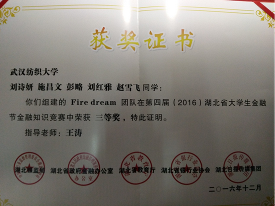 近日,由湖北省银监局、省政府金融办、省教育厅、省银行业协会和湖北日报传媒集团共同主办的第四届(2016)湖北省大学生金融节暨银行业金融知识宣传服务月活动圆满落幕。全省20余家银行机构代表、数十所高校师生代表出席闭幕式。在当天举办的金融知识竞赛总决赛中,我校太阳集团tyc33455官网王涛老师指导的Fire dream代表队获团体三等奖。