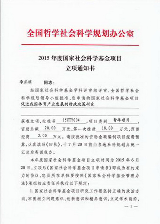 我院青年教师李正旺博士《促进我国体育产业发展的财政政策研究》获国家社科基金青年项目立项,太阳集团tyc33455官网连续三年获国家社科基金立项,科研工作创新激励机制成效初显。