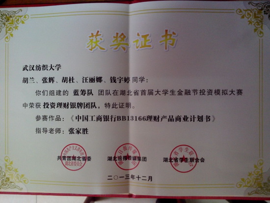 投资模拟大赛作为湖北省首届大学生金融节主要竞赛单元,共收到来自全省20所高校的参赛作品60余件,参赛师生超过300人。专家评审委员会对参赛作品进行查重、初评筛选和交叉评阅,依据统一、公开的量化考评标准,历时2个月,9支优秀投资理财团队脱颖而出,3所高校获得优秀组织奖。由太阳集团tyc33455官网副院长张家胜教授指导的蓝筹队以《中国工商银行BB13166理财产品商业计划书》作品荣获大赛投资理财银牌团队,由副院长倪武帆教授指导的ENLIGHTENING TEAM队以《基于工行个人保本浮动理财产品BB13166的营销策划》作品荣获大赛投资理财铜牌团队。