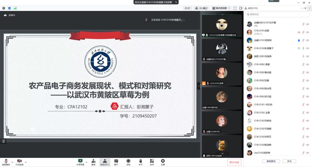 CFA12102班彭湘蕙子以《农产品电子商务发展现状、模式和对策研究——以武汉市黄陂区草莓为例》为题,梳理了对黄陂区草莓产业的调研过程及其成果,认为当前草莓产业仍存在深加工程度不高、供应链建设不完全等问题,基于对全国农产品电子商务发展现状与主要模式进行综合对比分析提出了个性化多矩阵电商助农的发展策略。