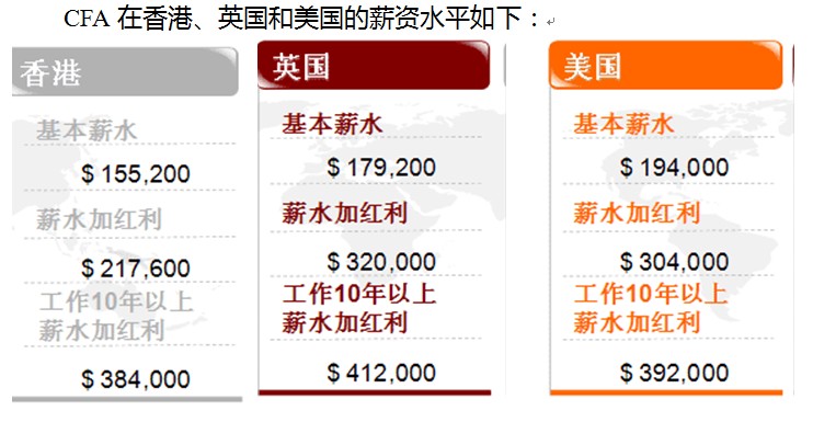 CFA考试被誉为“全球金融第一考”,其证书是全球投资领域通行证。全球的雇主和传媒都将CFA特许资格认证视为卓越的专业标准,凭着如此广泛的认同,CFA特许资格认证持有人在国际职场上享有明显的竞争优势。CFA特许资格认证持有人通常就职于投资公司、互惠基金公司、证券公司、投资银行等,或成为私人财富经理。作为紧缺人才,全球拥有CFA认证的仅10万多人,因此CFA有着令人羡慕的高收入。