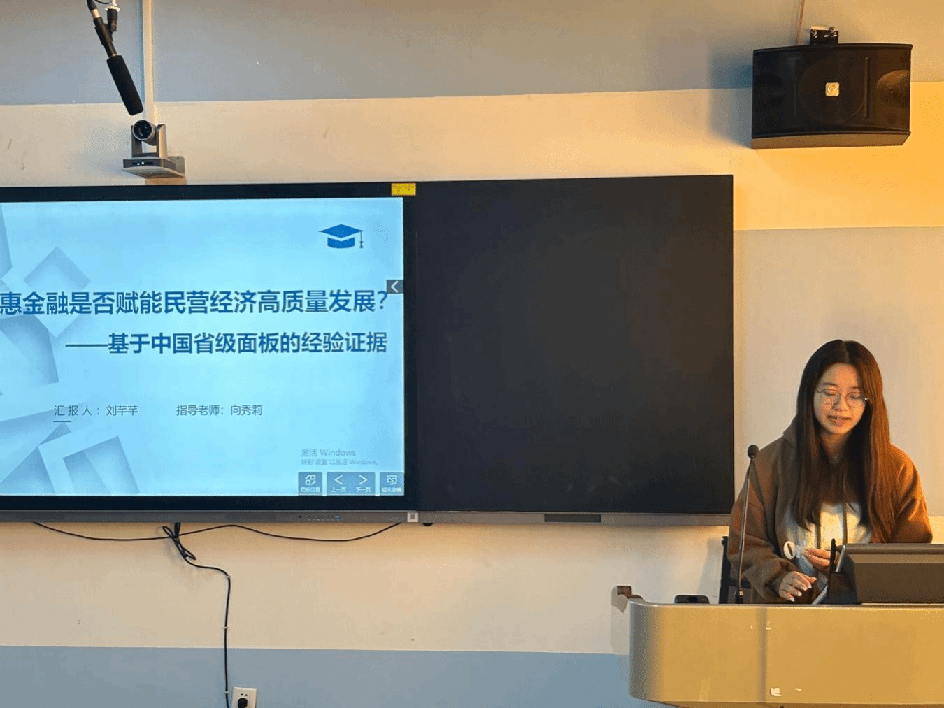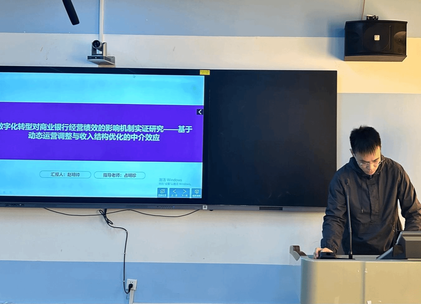 论坛上,四位主讲人以ppt的方式向同学们分享了他们最近的学术研究成果。赵家祥同学以“企业ESG评级对股票市场资产定价偏误的影响研究—基于中国A股上市公司”为题,基于中国A股上市公司的数据,深入剖析了ESG评级对资产定价的影响机制;赵明帅同学以“数字化转型对商业银行经营绩效的影响机制实证研究—基于动态运营调整与收入结构优化的中介效应”为题,通过实证研究分析,探讨了数字化转型对商业银行经营绩效的影响;刘芊芊同学以“数字普惠金融是否赋能民营经济高质量发展?—基于中国省级面板的经验证据”为题,基于中国省级面板数据进行了经验验证,为数字普惠金融在民营经济发展中的作用提供了有力证据;邬梦玲同学以“绿色金融资源配置对我国碳达峰的影响研究”为题,通过机制分析和数据测算探讨了绿色金融资源配置对我国碳达峰目标的影响,为绿色金融的发展提供了新视角。每位主讲人均从自己独有的学术视角切入,条理分明地阐述其学术研究内容,充分展现了学院研究生们优秀的学术水平。