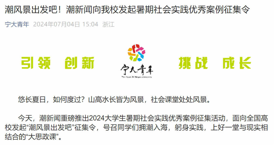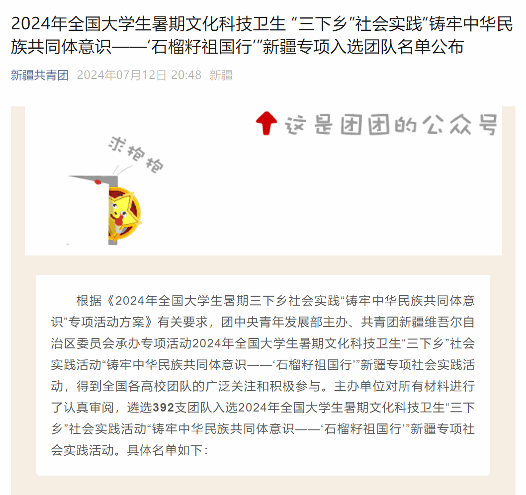 潮新闻(浙江日报)主办的2024大学生暑期社会实践优秀案例征集活动启动以来,短短12天报名时间内,共吸引了全国925支各具特色的实践团队加入,通过层层审核筛选,100支优秀的潮新闻“特别观察团”顺利入围。2024年全国大学生暑期文化科技卫生“三下乡”社会实践活动“铸牢中华民族共同体意识——‘石榴籽祖国行’”新疆专项实践活动启动以来,得到了全国各地高校团队的广泛关注和积极参与,主办单位对所有材料进行了认真审阅,最终遴选确定了遴选392支团队入选。