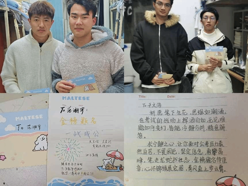 11月29日晚,写好的卡片由成长服务部干事细心分拣,走进宿舍,将这份温情传递到考公同学的手中,保证每一位考公学子能够感受到学院的温暖。卡片上的“加油,愿你金榜题名!”以及“这次一定成‘公’!”等话语激励着每一位考公学子。在这寒冬的冬天,温暖着每一个人的心,激励着每一位学子!