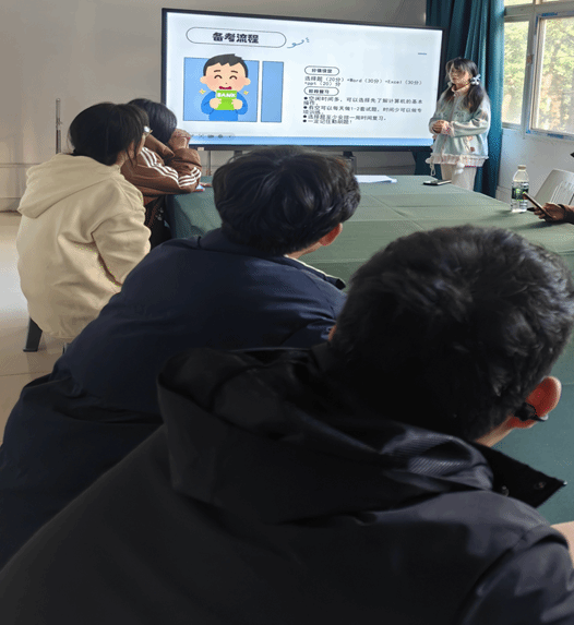 张秋文通过实际操作演示,从word文档的排版、excel数据的处理与分析及PPT的设计等方面,讲解了办公软件的应用技巧,让同学们更直观地掌握这些技能。陆渃昕则凭借丰富的参赛经验,向同学们阐述了竞赛的注意事项,分享了自己的总结方法和资源,并激励同学们积极参加比赛,增加实战经验,促进自身全面发展。随后,张烁围绕“如何高效学习”这一问题,引导同学们一是构建系统的知识体系,利用可视化工具进行理解和记忆;二是学会整理课堂笔记,提炼关键信息;三是制定明确目标,合理安排学习计划。同学们纷纷表示,此次活动让他们收获颇丰,不仅学到了具体的知识和技能,还拓宽了学习思路,明确了自身发展方向。