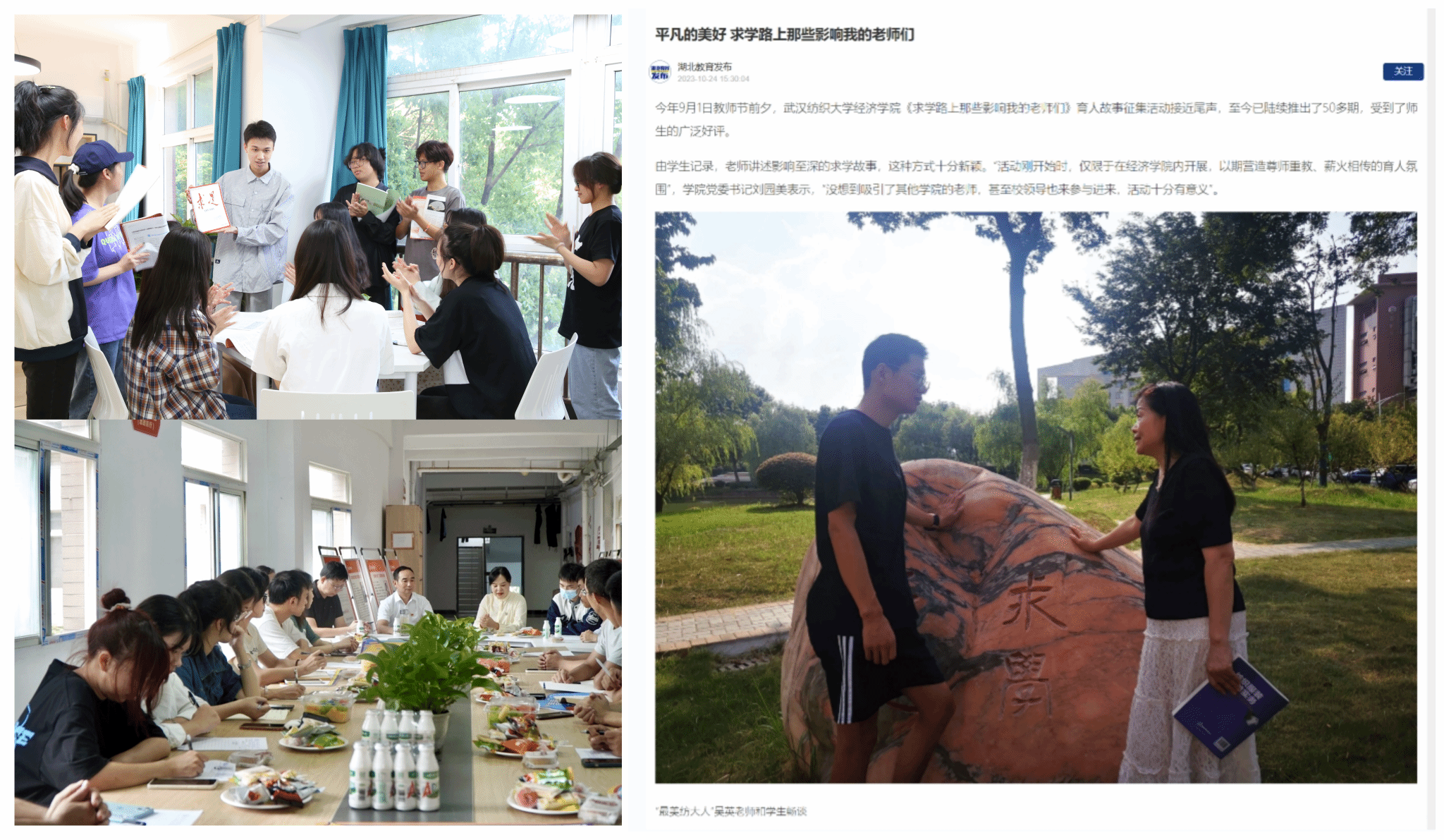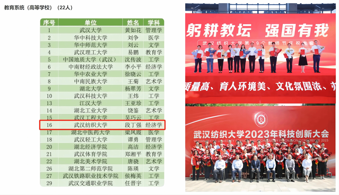 5.能力提升,队伍建设取得新进展。段丁强获评楚天名师、帅竞获评楚天学子;吴英获评“最美纺大人”,向秀莉获评学校“科研标兵”,廖庆梅获学校科学技术成果奖社科类二等奖。