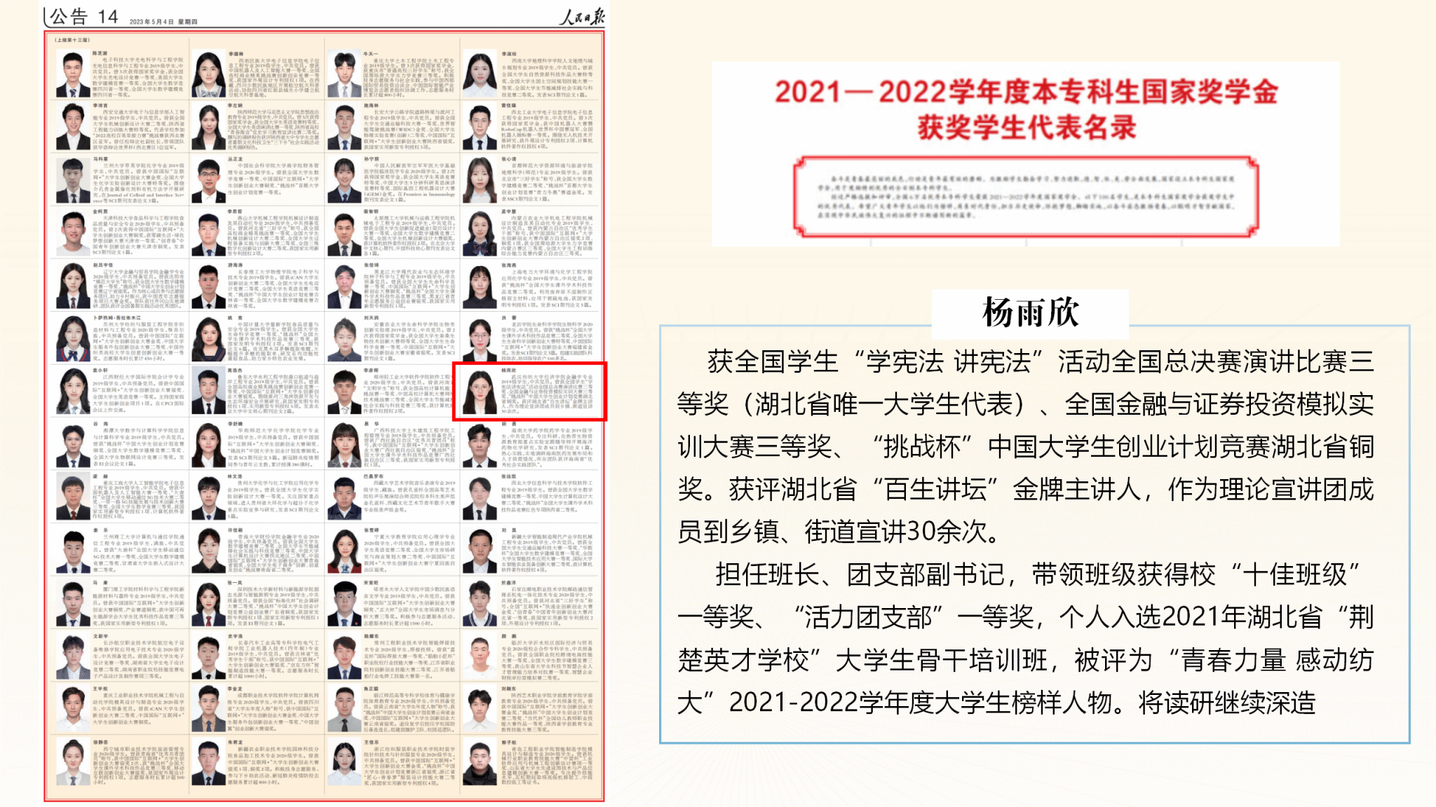 7.知行合一,育人工作再添新亮点。杨雨欣入选《人民日报》国家奖学金获奖学生代表名录;22名毕业生考取公务员、选调生、西部计划、三支一扶;升学率25.65%,较上年提升8.34%,出国留学16人;“青春护农”实践队获省部级荣誉5项。